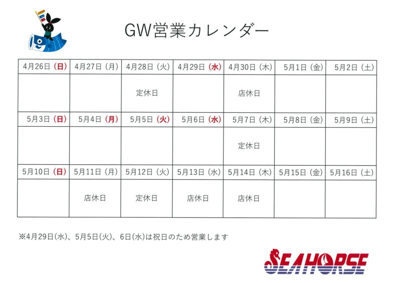 マリーナシーホースでは、4月29日(水)、5月5日(火)、6日(水)は祝日の為営業いたします。